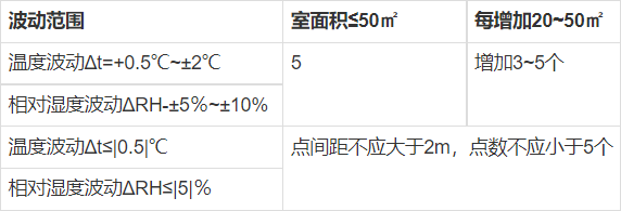 选点位置&数量:室内测点可在送回风口处或在恒温恒湿工作区具有代表性的地点布置。测点一般应布置在距外墙表面大于0.5m、距地0.8m的同一高度上;也可以根据恒温恒湿区的大小,分别布置在离地不同高度的几个平面上。具体测点数应符合表E.5.2的规定。