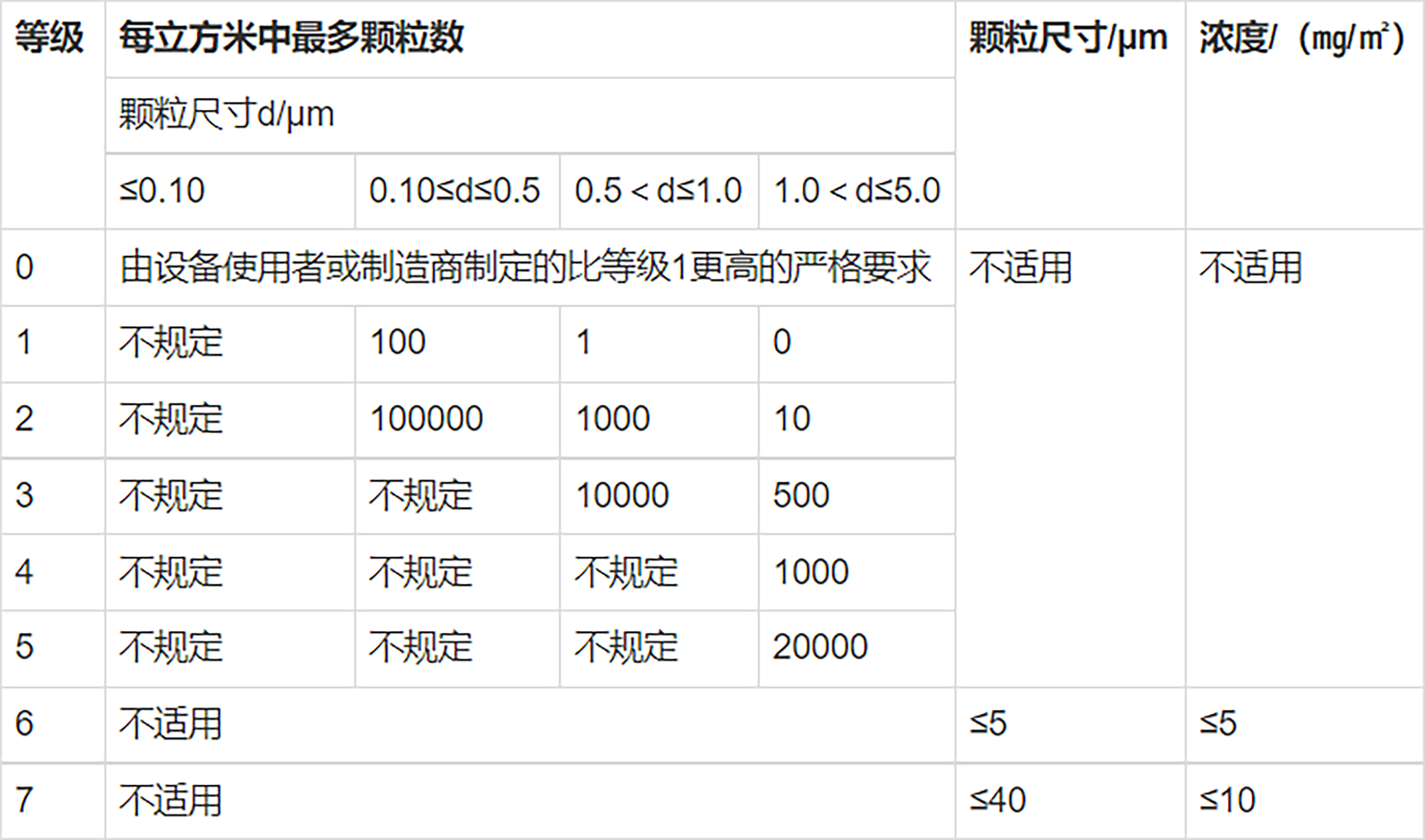 除上表的划分方式外,压缩气体洁净度等级也可参照洁净室空气洁净度等级,即压缩空气中粒子浓度上限不超过所在坏境的空气洁净度粒子限度,不会对周围环境造成污染,也可视为洁净度达标。
