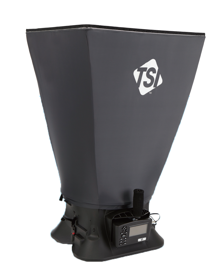 由于送风口局部气流的扰动和喷射速度产生的效应,建议采用风量罩捕集所有从终端过滤器或送风散流器流出的空气。可以用配有计量计的风罩,或是用风量罩出风的风速乘以有效面积。风量罩的固定位置应该能完全覆盖住过滤器或散流器,其表面应该靠在一个平坦的表面上,防止空气因旁流产生不精确的读数。如采用风量罩测量各个终端过滤器或送风散流器的风量,则应该在风量罩的排风端直接测量。