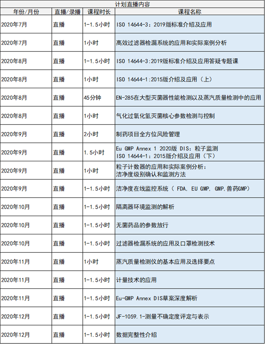 | Eu GMP Annex1 2020版与ISO 14644-1:2015版介绍及应用(下) |  | 洁净度在线监控系统(FDA、EU GMP、GMP、兽药GMP) | ISO 14644-3:2019版标准介绍及应用 |